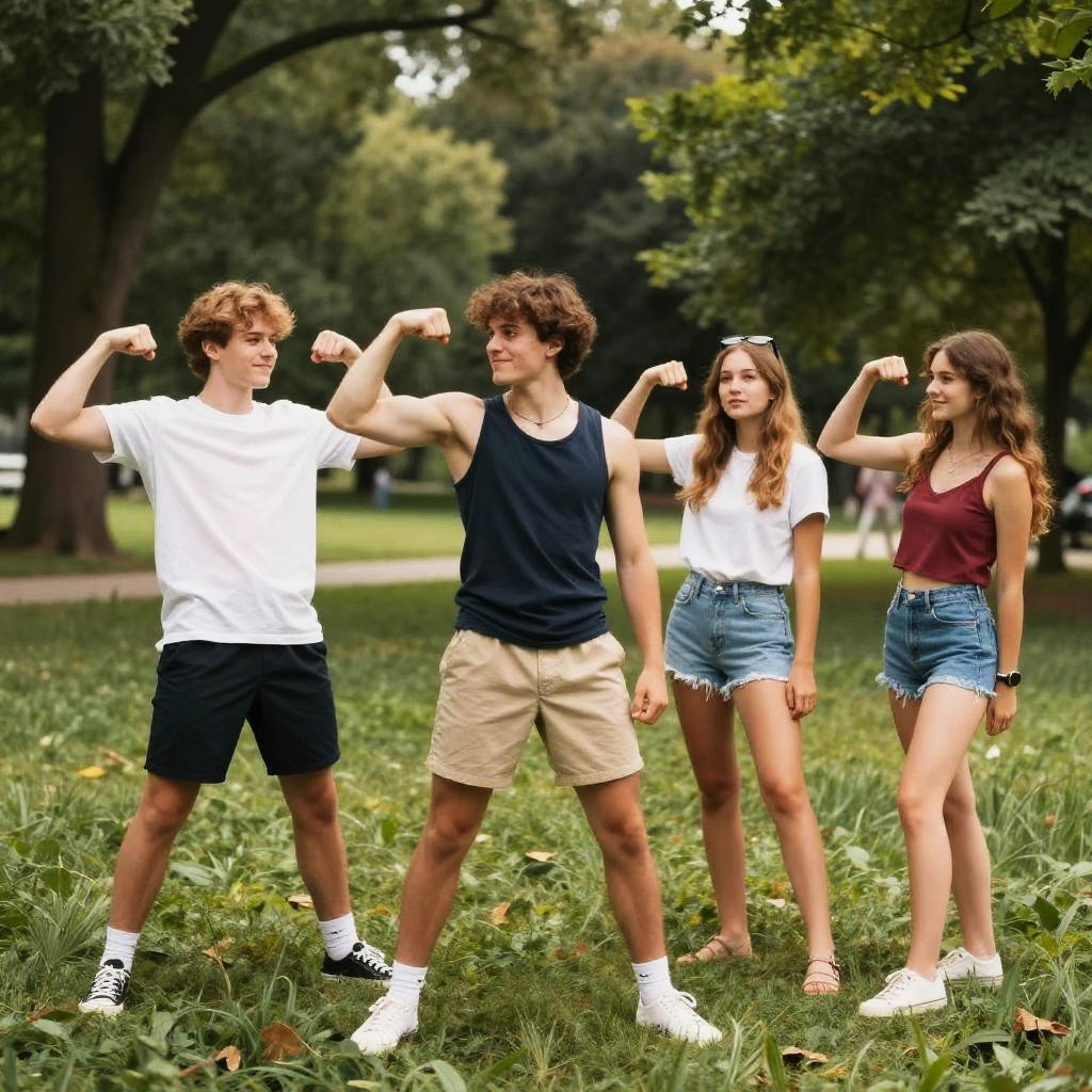 Teen flexing with friends at park, summer casual outfits, playful expressions, natural sunlight, lush green surroundings, candid style photography, vibrant and lively
