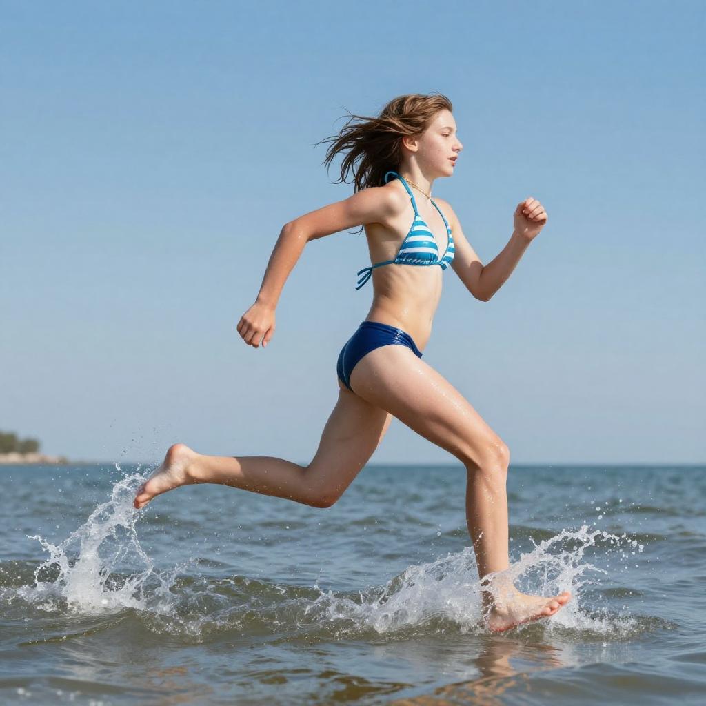 Teen wearing bikini running along the shoreline, splashing water, clear blue sky, dynamic motion, energetic summer day, vibrant and natural environment, sharp focus