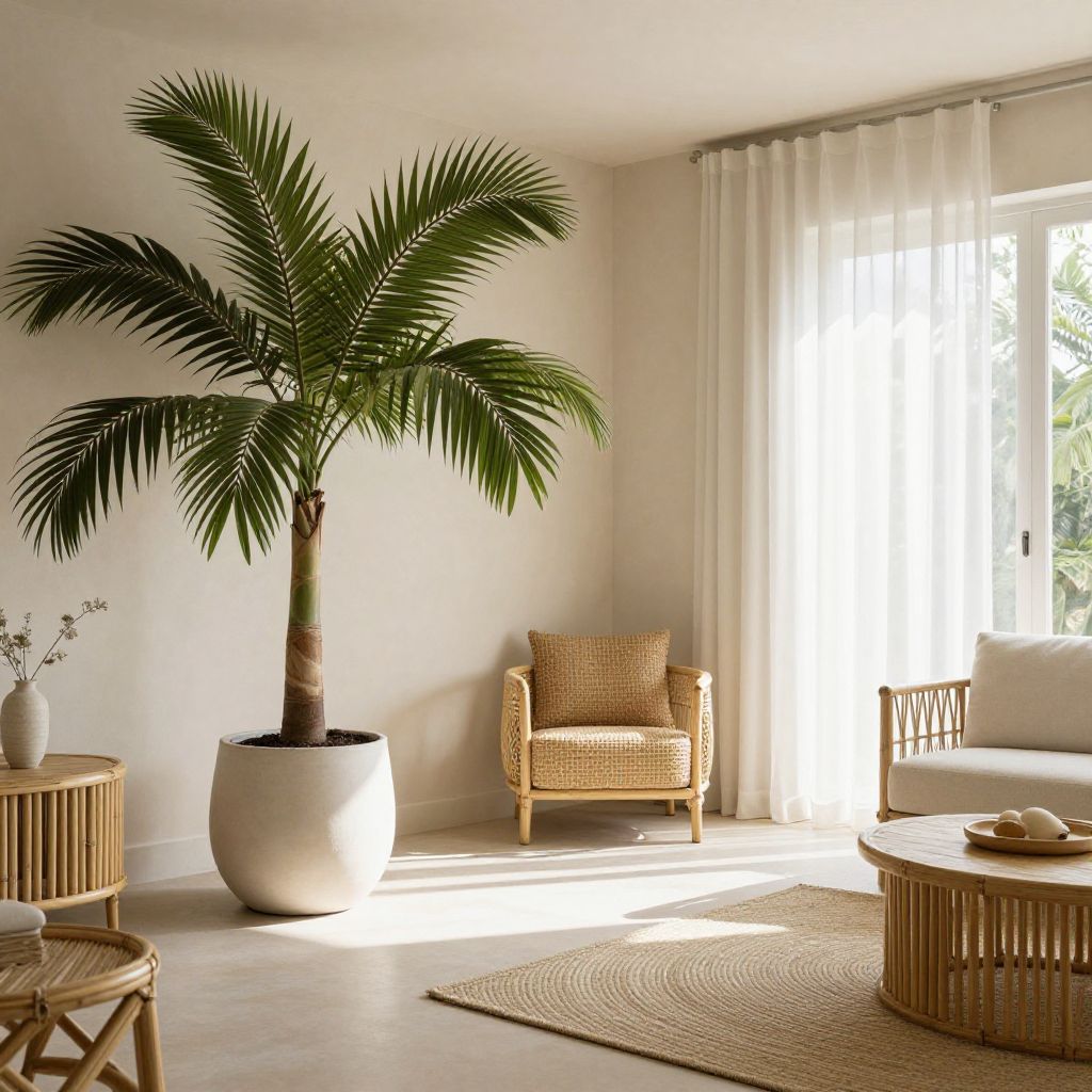 Minimalist tropical interior design with clean lines, warm beige and soft green palette, large palm leaves in simple white pots, bamboo furnishings, woven textures, and sunlight streaming through sheer curtains illuminating a peaceful, elegant tropical living room.