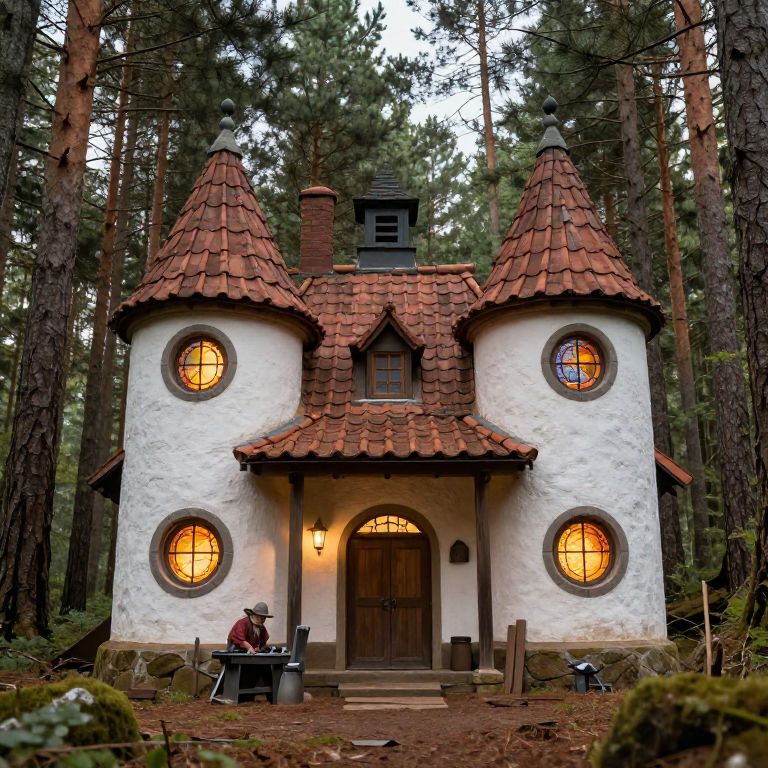 Photograph of a whimsical, white, fairy-tale cottage with two conical red-tiled roofs, set in a dense forest. The cottage has four circular, amber-lit windows: two on the sides and one on each roof. A central wooden door with an arched top is framed by a small porch with stone steps. A person in a red shirt and gray hat sits on a black chair to the left of the door, working at a small wooden table. Tall pine trees surround the cottage, creating a magical, secluded atmosphere. The ground is covered with brown pine needles and small bushes.