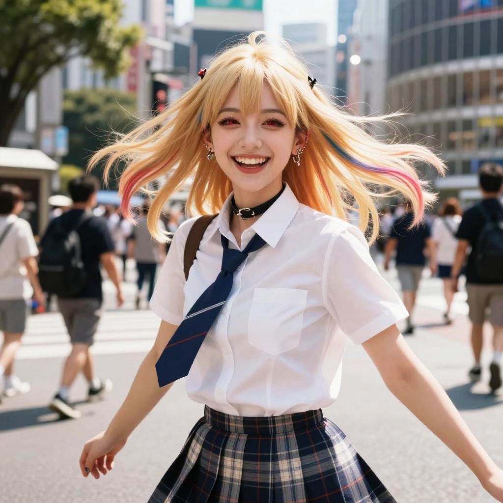 Masterpiece, top quality, best quality, official art, highres, ultra-high res, ultra-detailed, beautiful and aesthetic, perfect detailed face, detailed eyes, highly detailed, (photorealistic:1.2)1girl, dynamic pose, (dynamic angle), (depth of field:1.4, Vibrant Color Palette, Detailed and Realistic), blonde hair, long hair, multicolored hair, bangs, (red eyes), jewelry, earrings, piercing, school uniform, white shirt, tied shirt, black choker, blue necktie, plaid skirt, (grin:1.2), laughing, v-shaped eyebrows, teeth, cowboy shot, outdoors, ((smile, happy, playful)), summer, Shibuya Center Street, wind, sunlight, walking, movement, teenage, fashion model, nail art, false nail, shrugging, looking at viewer