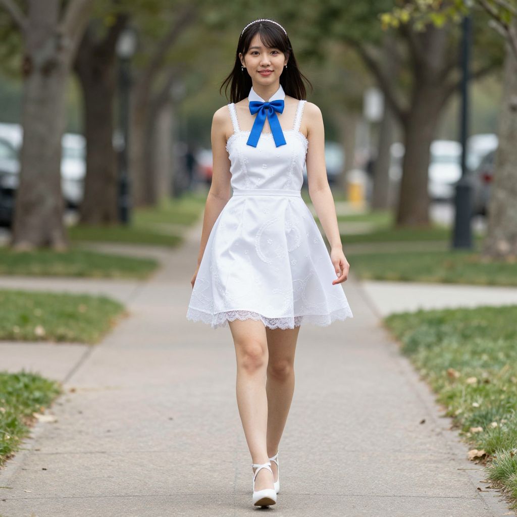 Photograph of an Asian woman with long black hair, fair skin, and a slender build, walking down a tree-lined sidewalk. She wears a sleeveless, white, knee-length dress with lace trim and a large blue bow at the chest, paired with white lace-up shoes. The background features blurred green grass and trees, with a few indistinct parked cars on the left. The woman's expression is neutral, and she strides confidently forward, centered in the frame. The image has a bright, natural light, emphasizing the white dress against the green and brown surroundings.