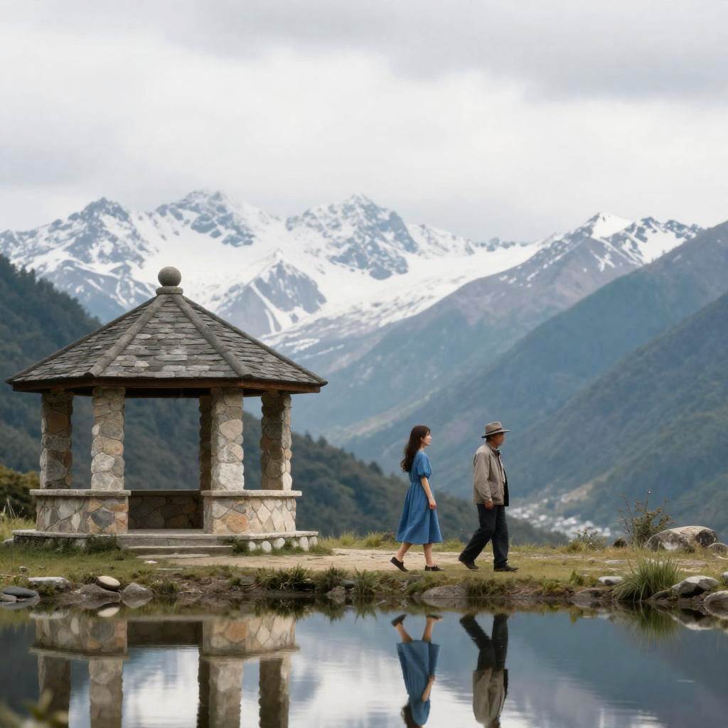 Photograph of a serene mountain landscape. A small stone pavilion with a pointed roof stands on the left. A young woman with brown hair in a blue dress walks beside an older man in a hat. Both are reflected in a still pond. Snow-capped mountains and cloudy sky form the background. The woman's back is to the camera, the man faces slightly right.
