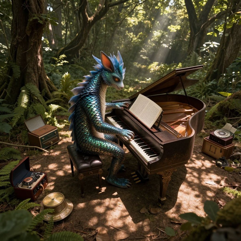 Craft an enchanting surrealist scene where a resplendent creature with shimmering scales perches atop an elegant piano, delicately caressing its strings as it composes an alluring symphony. The fantastical setting is adorned with antique music players scattered across the forest floor, blending the realms of nature and nostalgia. Capture this mesmerizing world from above, revealing dappled sunlight streaming through the canopy and painting intricate shadows upon the scene beneath. This image should exude a sense of awe and intrigue, as if one has chanced upon an enigmatic realm where reality intertwines with fantasy.