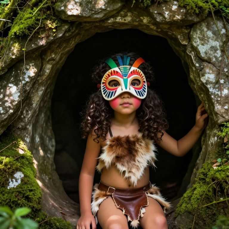 A vibrant, high-resolution photo of a petite, curly-haired girl dressed as a cave girl cutie with a colorful tribal mask, woven animal hide fabric, and a leather loincloth, posing by a natural cave entrance in a lush forest setting with moss-covered rocks and morning sunlight filtering through the stone arch. Her face has soft features, rosy cheeks, and large, expressive eyes that show wonder and innocence.