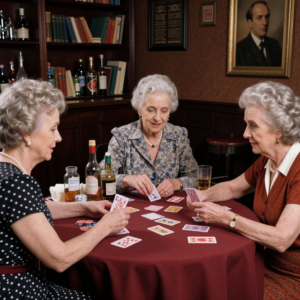 In this highly detailed and intricately composed image, three elderly women with gray hair are engrossed in a card game at a table adorned with numerous bottles and glasses. The scene is set in a dimly lit, vintage bar, reminiscent of the 1940s, with rich, warm colors that create a cozy atmosphere. The women, dressed in elegant attire, are deeply focused on their game, their hands reaching out to manipulate the cards and tokens. The table is cluttered with various bottles, glasses, and other gaming paraphernalia, adding to the sense of immersion and realism. The background features a bookshelf filled with books and a portrait of a man, contributing to the ambiance of a well-lived, sophisticated space. The overall composition is sharp and detailed, with a studio shot quality that enhances the textures and colors of the scene. The image is a striking representation of a moment in time, capturing the essence of camaraderie and leisure in a bygone era.