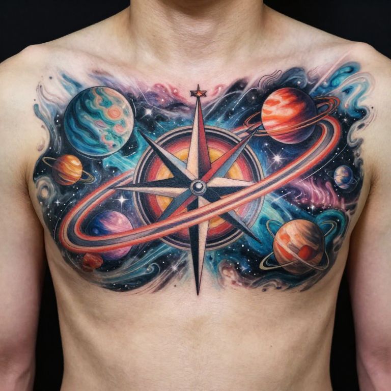 Tattooed shirtless male chest featuring a vibrant, colorful space design with planets, rings, stars, and a compass-like starburst center.