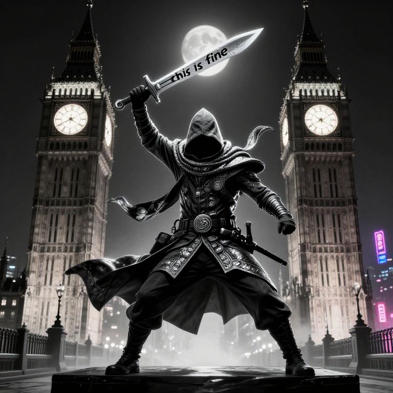 Sign on the wrench say \"this is fine\", fantastical image of a assasin holding sword like wrench, Their filled with power and determination, scarf ornate, clad in flowing, flowing scarf, as they wield the scarf n a fluid, standing under the two clock tower building like an assassin, standing pose, dynamic pose, two clock towers with a bridge, darkness of night fall, neon city, neon lights, moonlight fog, glowing, shiny, scifi, intricate artistic color, cinematic light, radiant, vibrant, perfect symmetry, Grayscale, very dark, Dramatic spotlight, highly color focused, skindentation, dynamic motion
