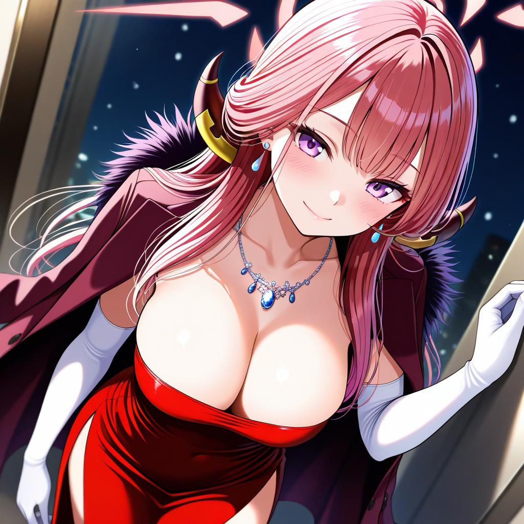 Aru (dress) (blue archive), blue archive, 1girl, demon horns, brown horns, yellow eyes, pink hair, long hair, red hair, large breasts, cleavage, collarbone, red dress, white gloves, coat on shoulders, strapless dress, elbow gloves, red coat, jacket on shoulders, halo, pink halo, earrings, necklace, side slit, by artist kentaurosu, illustrious
