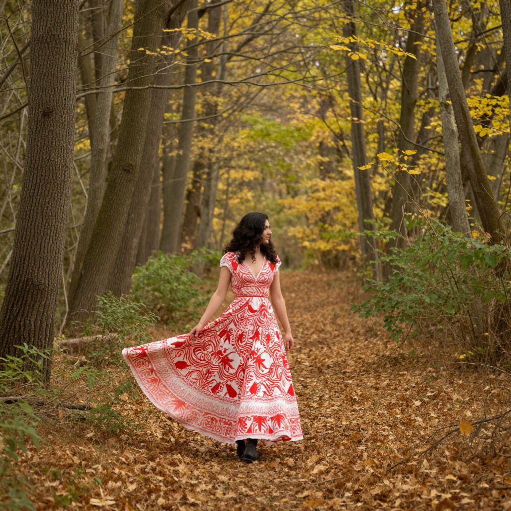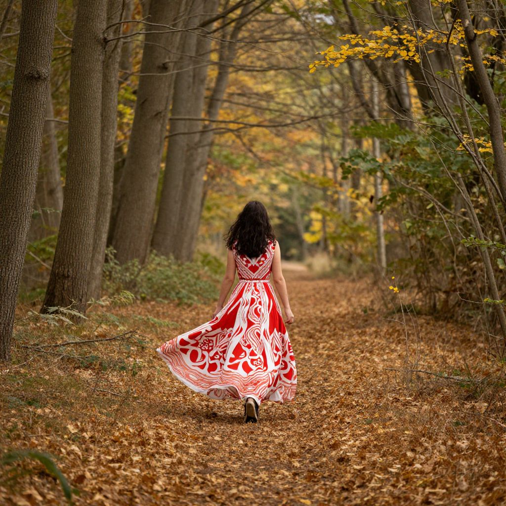 Woman in a vibrant red and white patterned dress strolls through a serene autumn forest, her flowing gown trailing behind as she walks along a path carpeted with golden leaves, surrounded by towering trees and lush undergrowth.