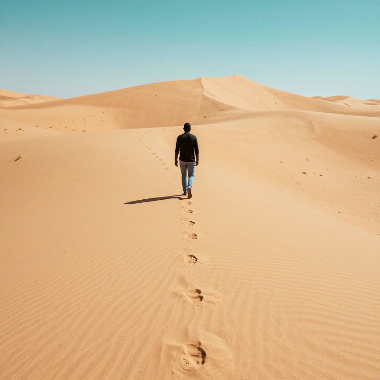 Sole figure walks away from the camera along a winding trail of footprints etched into the golden sands of a vast desert dune, beneath a clear turquoise sky.