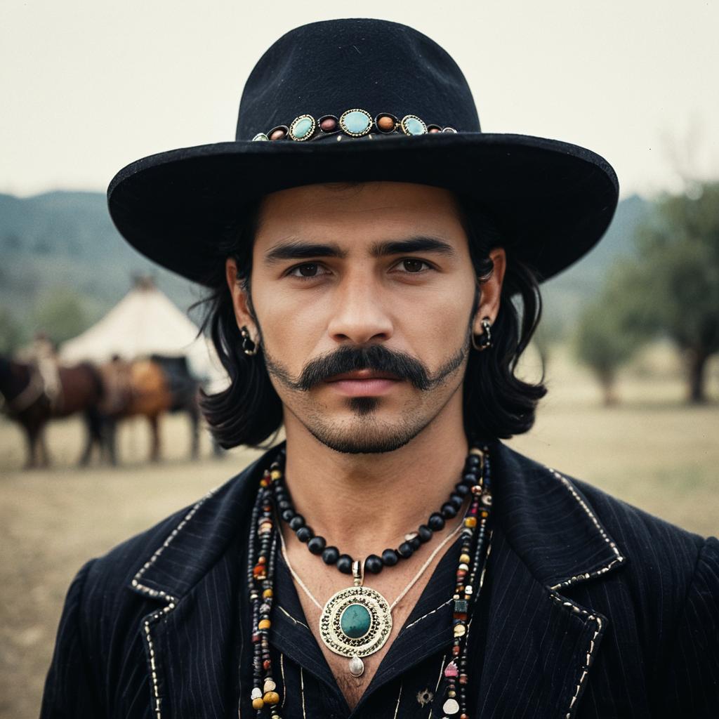 Portrait of a man wearing a black cowboy hat adorned with beads and stones, a pinstriped jacket, and multiple necklaces including a large pendant. He has black hair, a styled mustache, and earrings. The outdoor background depicts a blurred rural setting with horses and trees.
