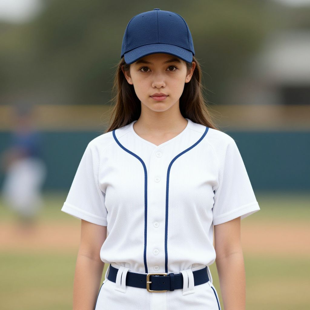 "vintage baseball costume, solo, 1girl, hat, realistic, blurry background, baseball cap, belt, striped shirt, blurry, shirt, brown hair, looking at viewer, brown eyes"