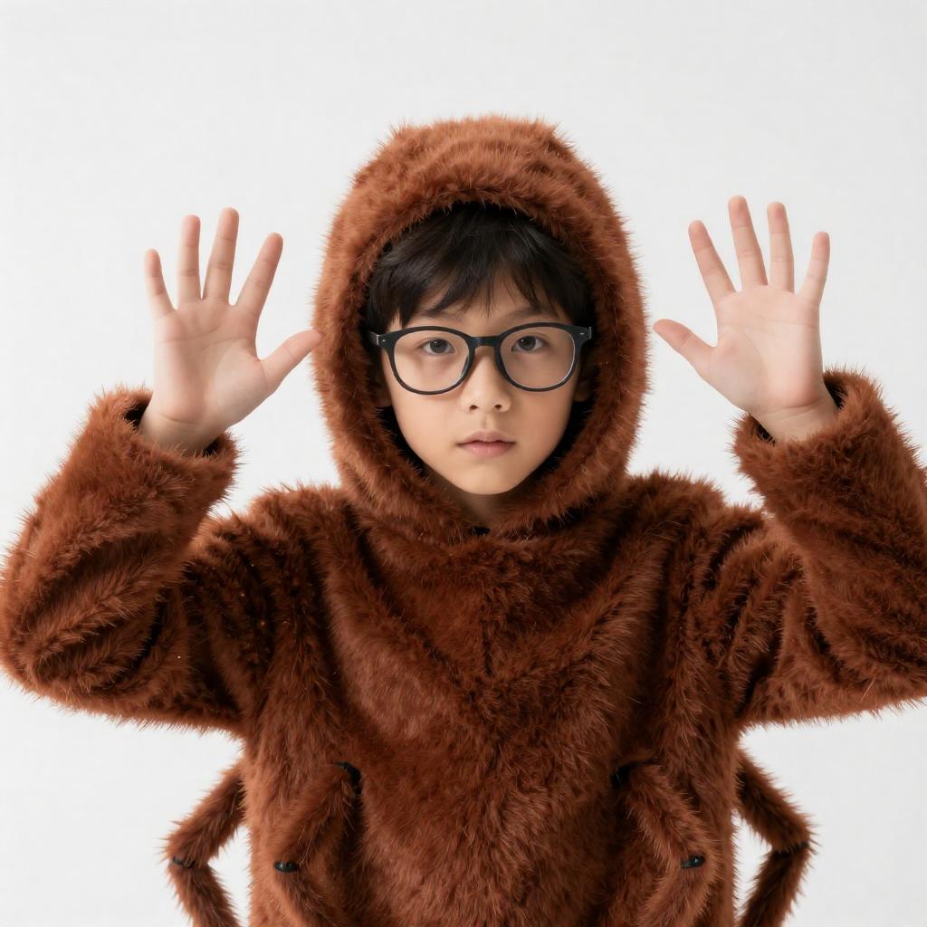 Photograph of a young boy with glasses, wearing a fuzzy, brown, spider-like costume. He raises both hands, fingers spread, against a bright white background. The costume's ure is shaggy and resembles spider fur. The boy's expression is focused.