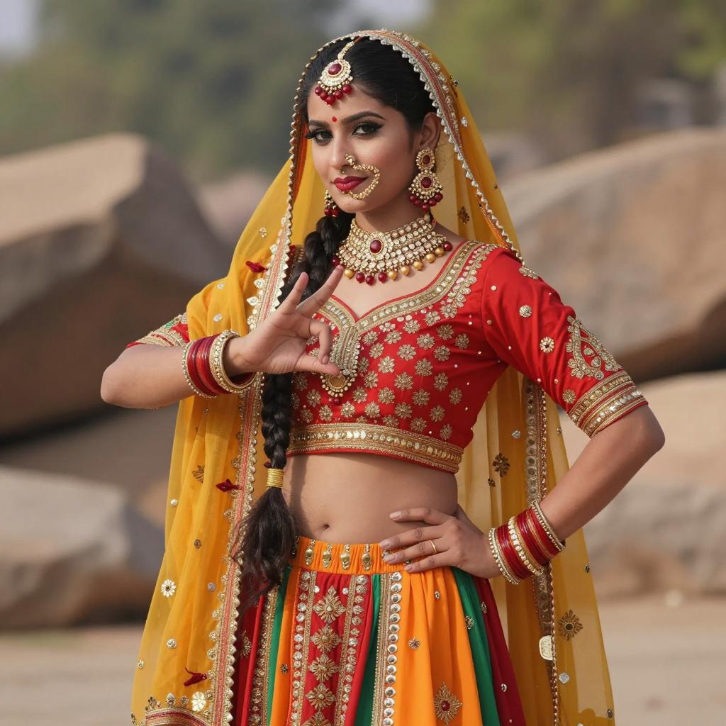 Punjabi bhangra dance, photorealistic, Indian woman, traditional Punjabi attire, detailed jewelry, red and orange outfit, intricate embroidery, gold and green accents, braided hair, yellow headscarf, red headpiece, ornate necklace, large earrings, midriff exposed, confident pose, hand gesture, outdoor background, rocky terrain, blurred greenery, sunny, ethnic fashion, cultural dress, vibrant colors, historical influence, traditional beauty, elegant, detailed ures, realistic lighting, elegant composition