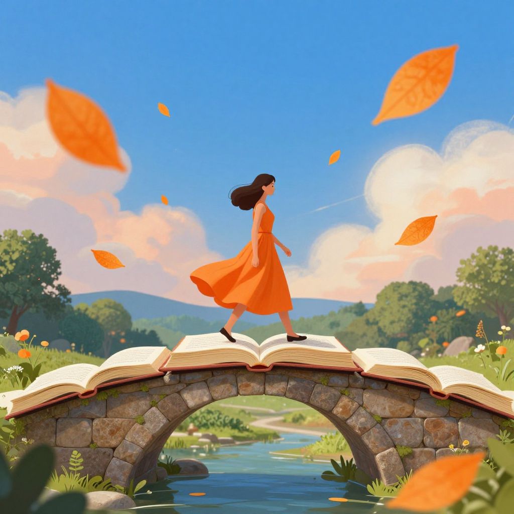 A whimsical digital illustration depicts a serene scene where a woman in a flowing orange dress gracefully walks across a stone bridge composed of open books, symbolizing the journey through stories, with vibrant orange pages fluttering like leaves in the breeze against a vividly painted sky and lush landscape.