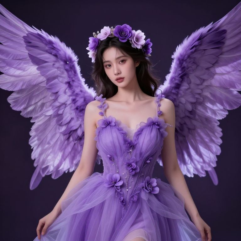 Female angel with purple wings and a purple dress with flowers on her head.