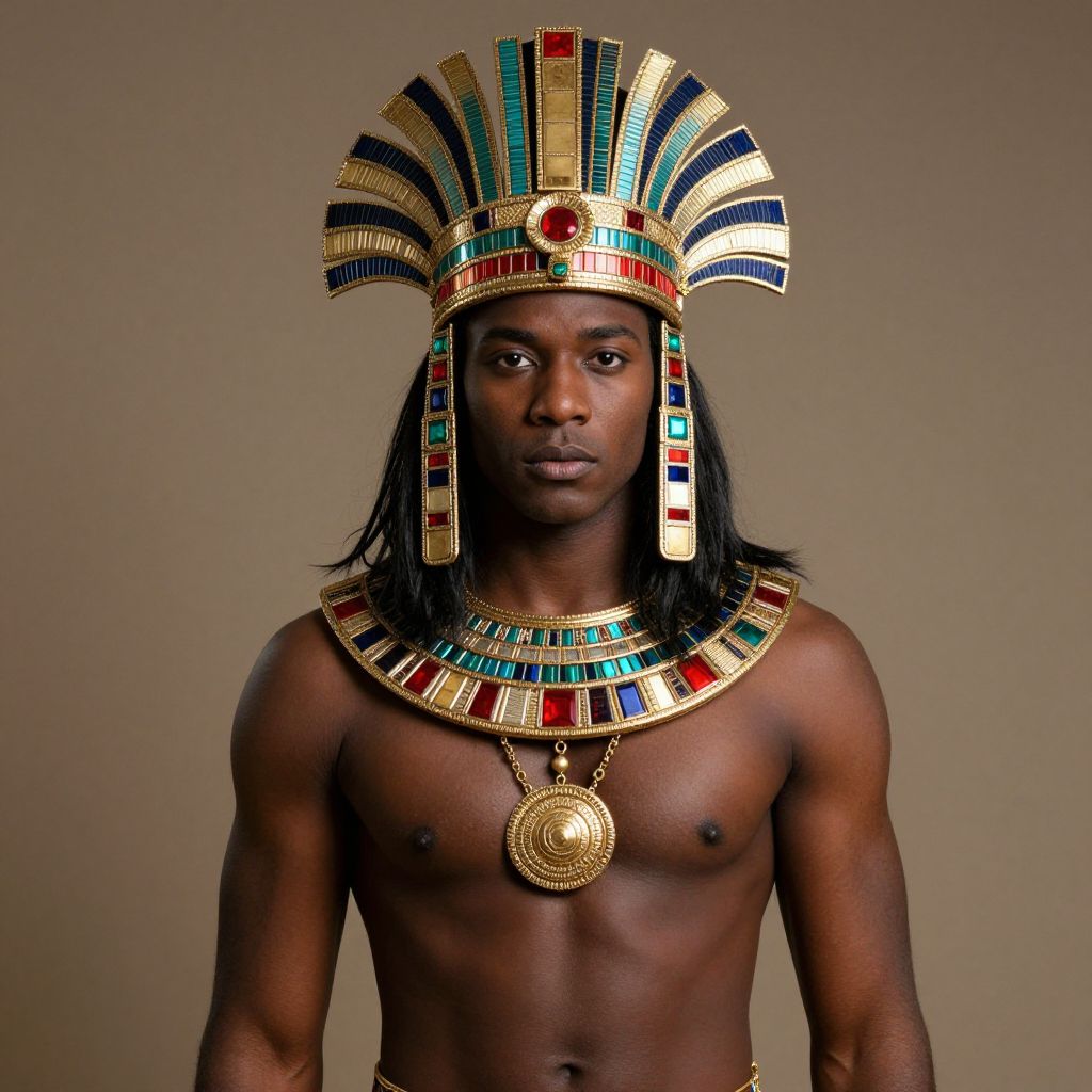 Photograph of a muscular, shirtless Black man with long black hair, wearing an Egyptian-style headdress and necklace with colorful jewels, against a plain