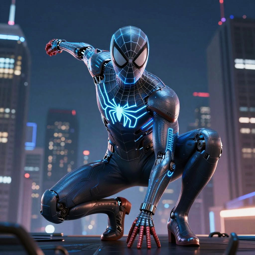 Close-up of white spider suit gloves and mask, detailed webbing texture with subtle silver highlights, ambient neon city background, cyberpunk aesthetic with sharp shadows