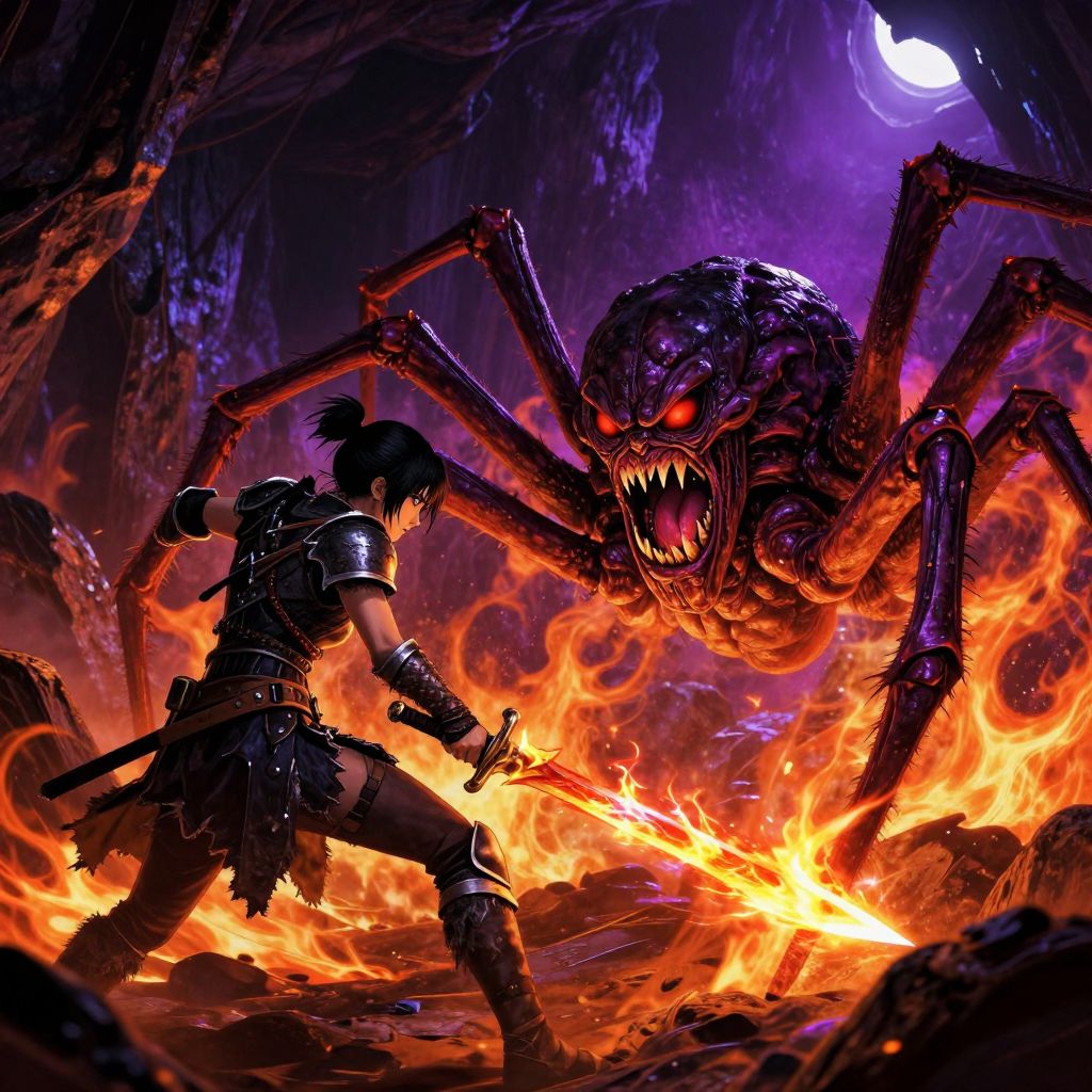 A comic book-style scene set on an open, snow-covered, post-apocalyptic plain at night, An African female mage, seen from behind, knees bent with one foot in front of the other in a stance as if about to leap forward, Her medium-length black hair flows back, framing her rugged, focused face, Muscular arms emit fiery magic, flames rippling from her skin and casting an orange glow across the snowy landscape, She wears heavy, sleeveless armor with a furry collar, a loose red scarf trailing behind her, rugged pants tucked into combat boots, and an armored shirt under her jacket, Her raised clenched fists are held in front, her entire body braced with tense anticipation, Facing her on the snowy plain is a towering headless grotesque monster, Its torso is a tangle of tentacle appendages, crawling on the ground on spiderlike bony legs, A tentacle is curling outward in an eerie, probing gesture, Moonlight reflects off its slick, mutated skin, giving it an otherworldly glow, Snow swirls between them, catching the mage’s fiery light, contrasting against the cold, pale blues of the empty plain, The open landscape amplifies the feeling of isolation and impending conflict, as if everything holds still, awaiting their clash