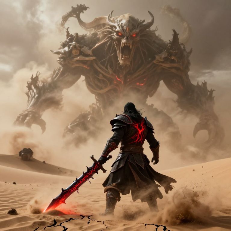 Digital fantasy artwork: Warrior with fiery hands battles skeletal monster under full moon in snowy forest, red scarf flowing in wind.