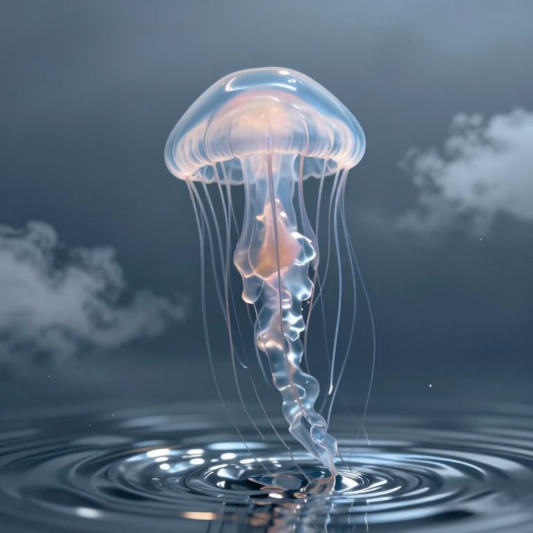 Photorealistic CGI of a glowing, translucent jellyfish with long, flowing tentacles, floating above rippling water, against a dark blue, mist