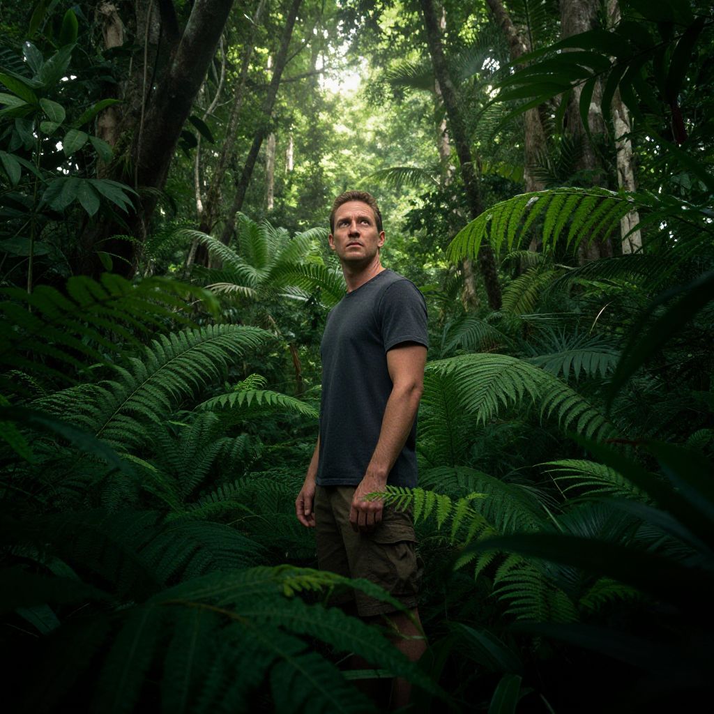 Photograph of a Caucasian man with short brown hair standing in a dense, lush forest. He is wearing a dark gray, short-sleeved t-shirt and camouflage pants. His expression is serious and focused. Surrounding him are large, vibrant green ferns and tall trees with thick trunks. Sunlight filters through the tree canopy, casting dappled light on the forest floor. The background is rich with greenery, creating a thick, almost impenetrable jungle-like atmosphere. The man is centered in the image, slightly to the right, with ferns framing him on both sides.
