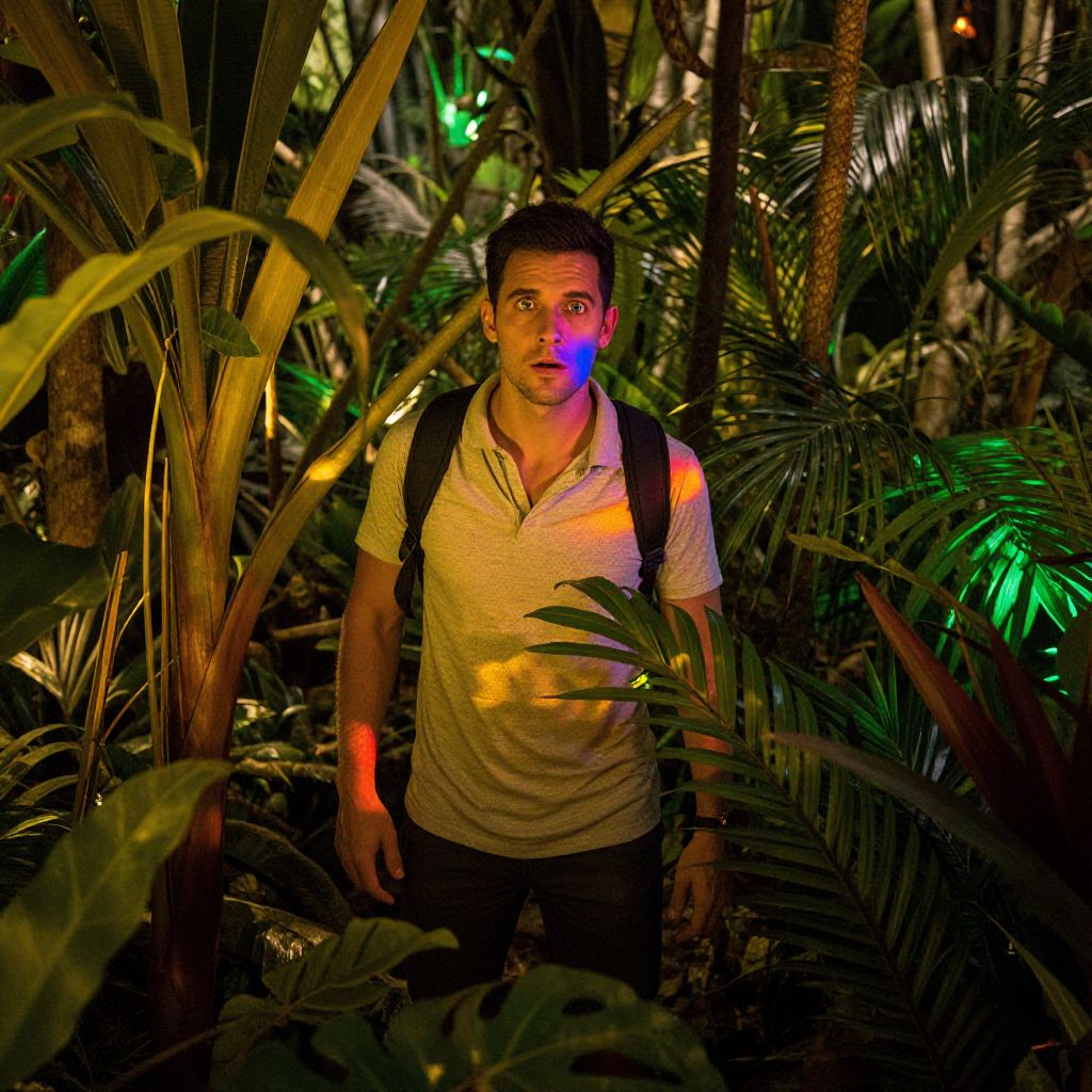 Exquisite, cinematic composition: A man stands tall, surrounded by lush, verdant tropical foliage, with sunlight filtering through the dense canopy above. Captured in an establishing shot, this scene showcases the rich, emerald hues of the leaves, exuding a sense of serenity and adventure. The subject's posture conveys curiosity, as he Man has masculine face and piercing eyes
