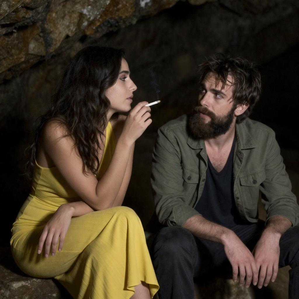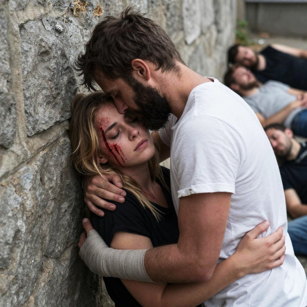 A bearded man with dirty, disheveled hair wearing a white t-shirt embraces a blonde woman with a bloodied face and a black shirt against a rough gray stone wall. The woman’s eyes are closed as the man’s head rests gently on hers, his arm wrapped in gray fabric. In the background, several injured people lie on the ground, creating an intense and emotional scene.