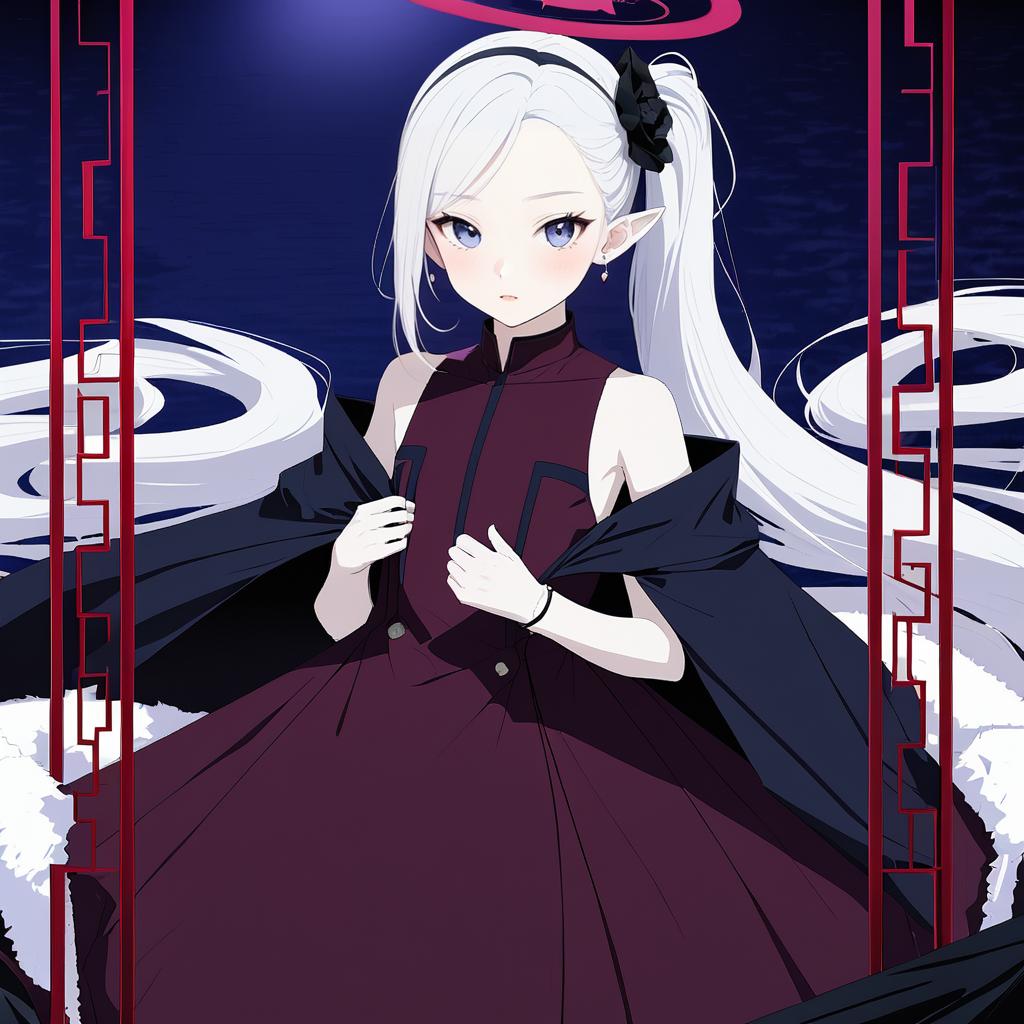 Digital anime-style illustration of a young girl with long, white hair tied in a high ponytail, adorned with a black hairband. She has large, blue eyes and a pale complexion. She wears a sleeveless, dark purple dress with black accents and a black cape draped over her shoulders. A glowing red halo hovers above her head. The background is a deep blue with red geometric patterns framing the sides. The girl's expression is calm and slightly serious, and she stands centrally with her hands gently holding the edges of her cape. The overall style is sharp and modern, with a slightly gothic influence.