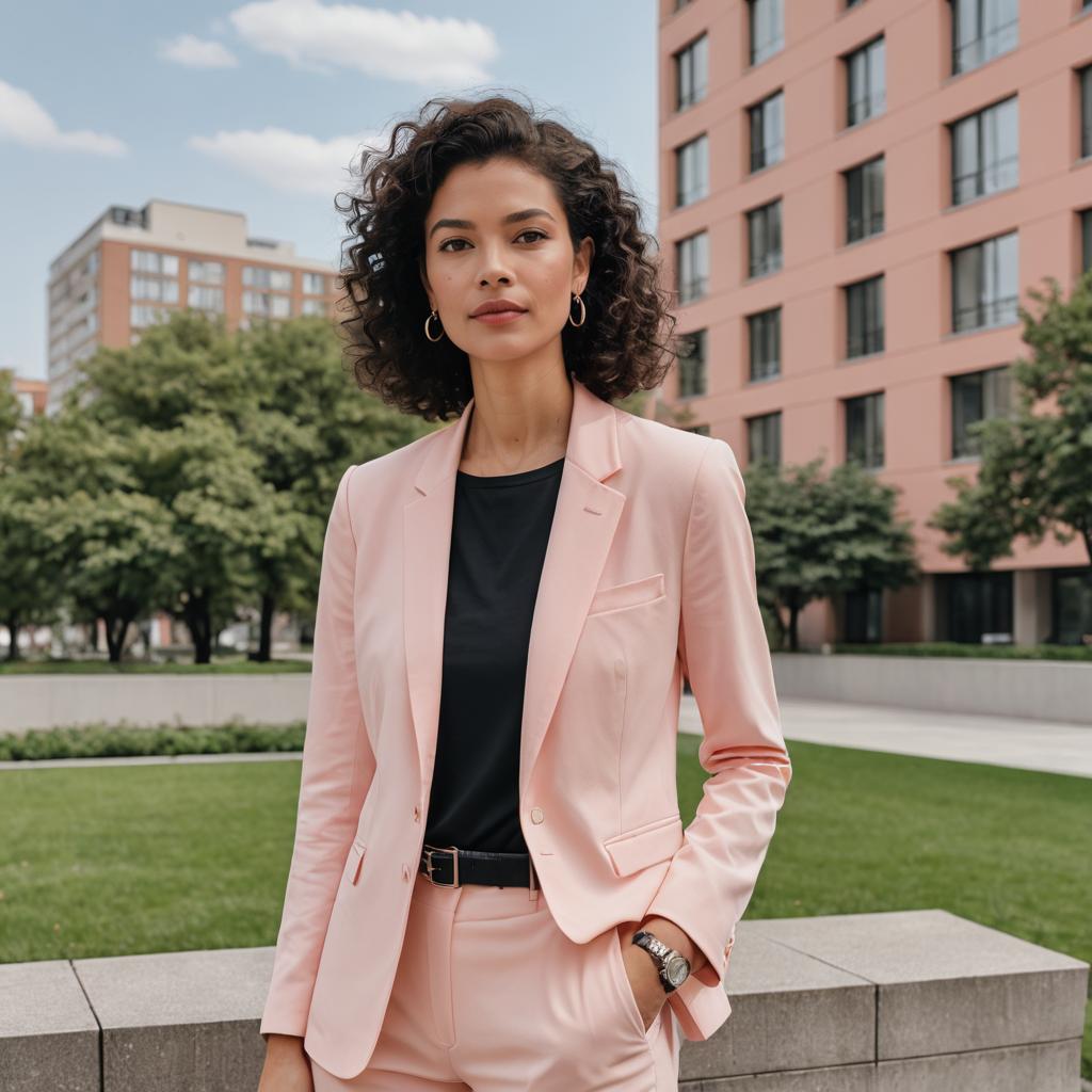 Photo of a Narrow Shoulders woman, Short Curly, minimalist outfit, monochrome palette, neutral tones, sleek lines, tailored Coral Pink blazer, white cotton t-shirt, black slim-fit Straight-Leg trousers, leather Wide Strap Heels, minimalist watch, modern, understated elegance, Sunny Picnic Area, Cityscape Photo