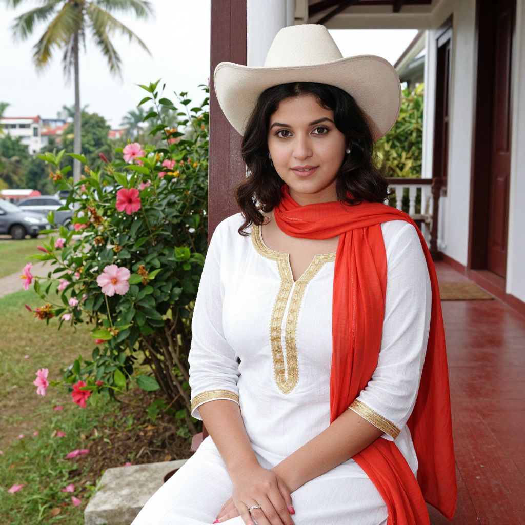 A radiant woman with fair skin, dark wavy hair, and deep brown eyes dressed in a vibrant Indo-western fusion outfit: a white cotton kurti with golden border and a red saffron scarf draped over her shoulders, paired with a wide-brimmed cowboy hat, sitting on a red wooden deck in a colonial-style home overlooking a blooming hibiscus garden in a tropical South Asian city. The woman has big tits and cute face