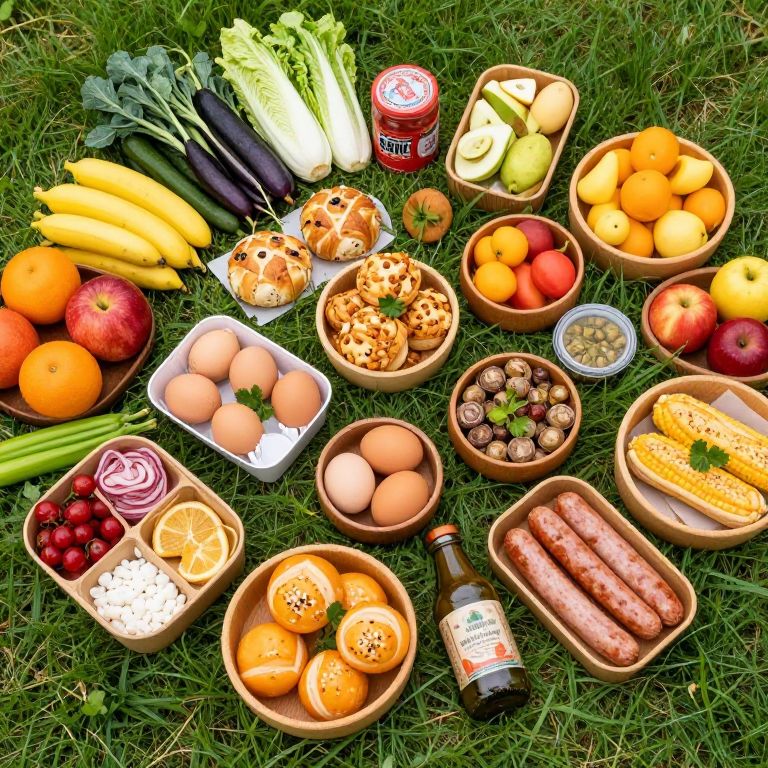 Colorful flat lay of diverse picnic foods arranged outdoors on a grassy surface, featuring vibrant fruits, vegetables, baked goods, eggs, sausages, and condiments neatly organized in wooden bowls and containers.