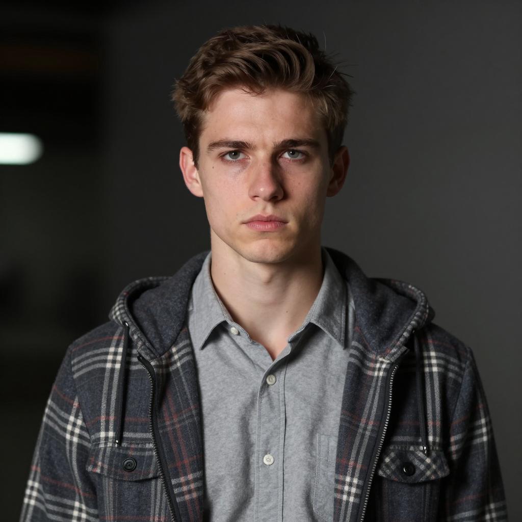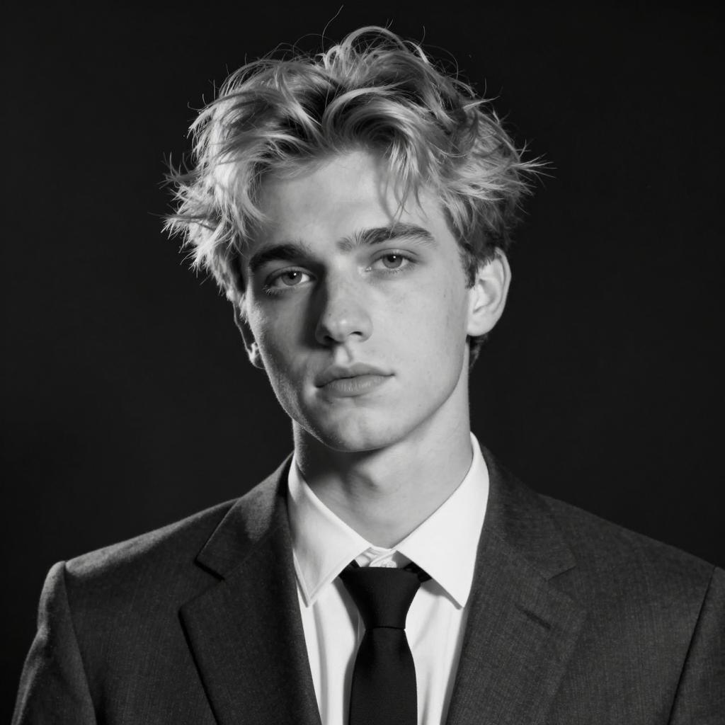 Black and white photograph of a young man with messy, voluminous, light-colored hair. He wears a dark suit with a white shirt and black tie. Background is dark with a ured, grainy effect. Man's face is centered, looking slightly to the left, with a neutral expression.