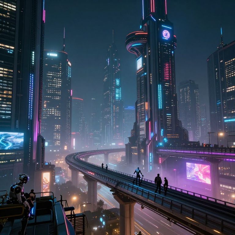 Futuristic settings featuring a sprawling cyberpunk metropolis at night, illuminated by vibrant LED lights, with advanced robots interacting with humans, sprawling elevated transit systems, and towering metallic structures shrouded in mist and neon haze.