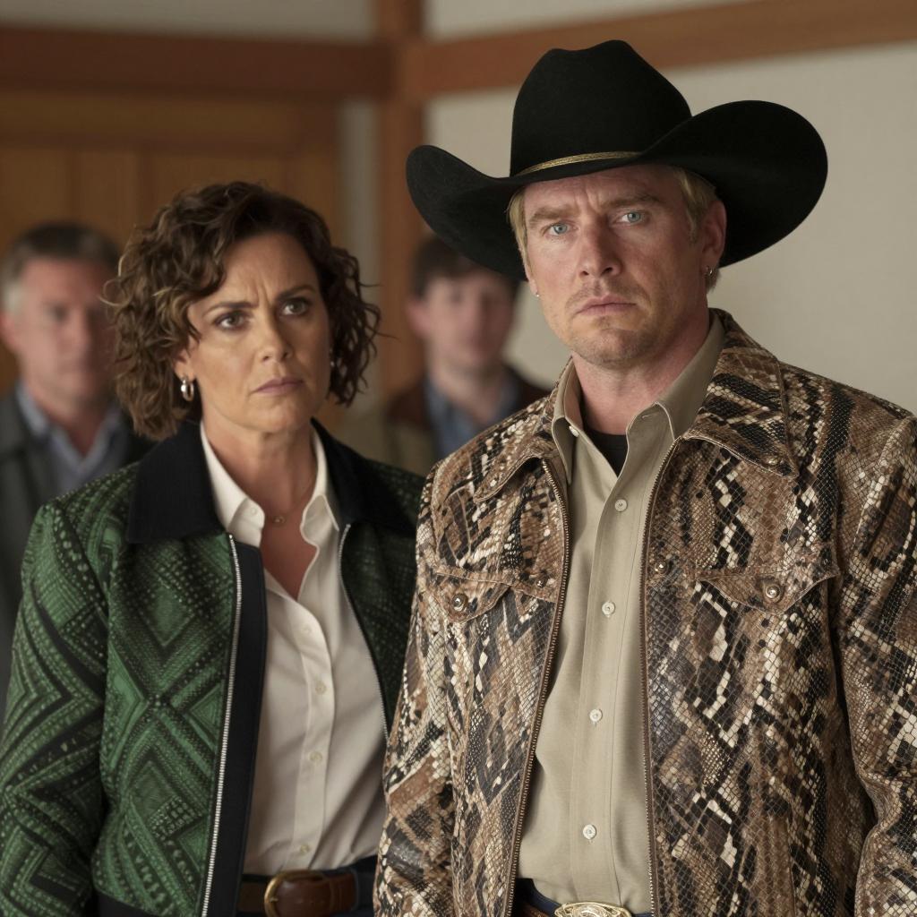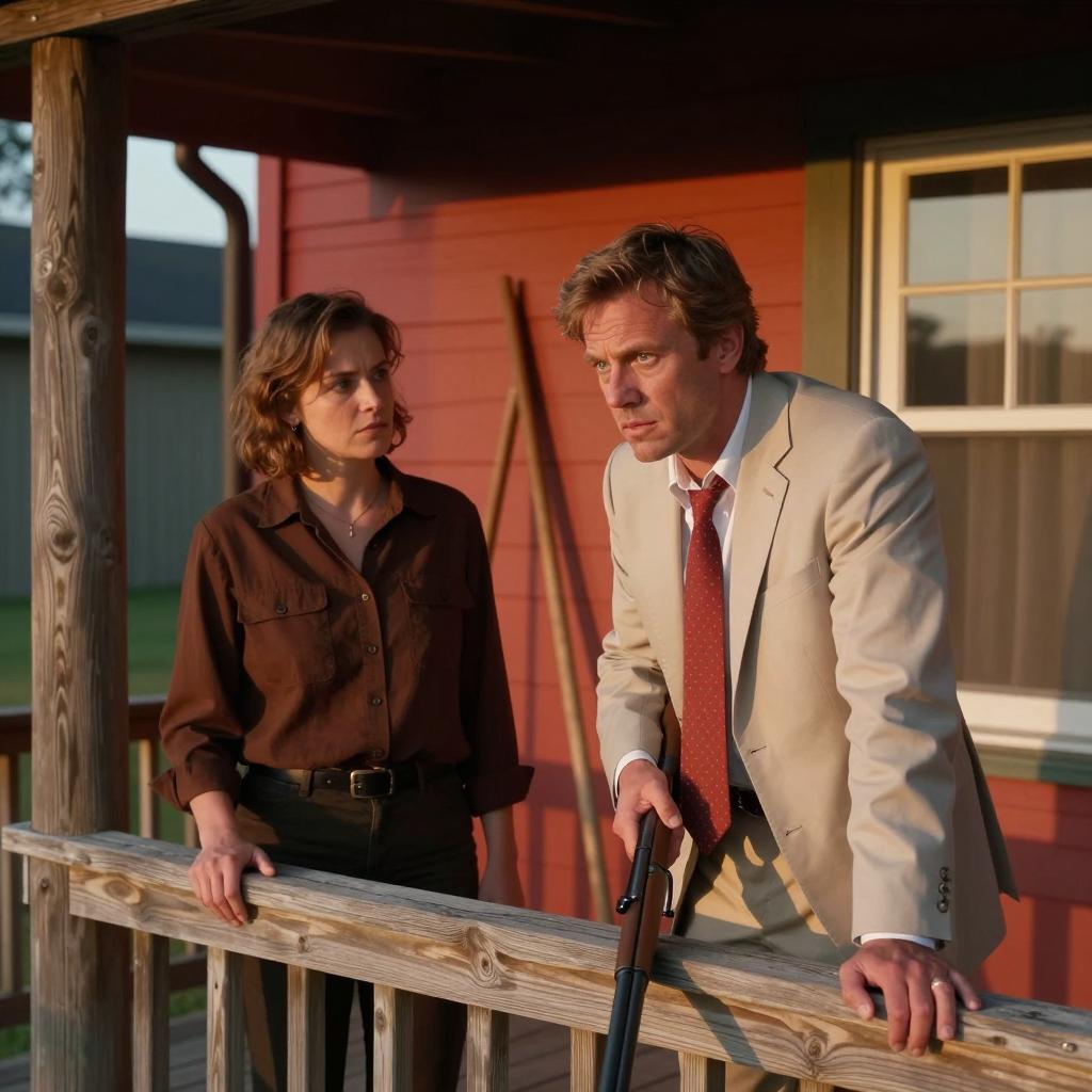 Two people on a wooden porch at sunset. Man in light beige suit and red tie, holding a rifle, leaning forward with intense expression. Woman in brown shirt, standing with hands at sides, looking at him. Red lighting casts shadows. Wooden posts and railing in foreground. Background includes ured wall and window. Both have light brown hair. Man's right hand on porch railing, woman's left hand resting on it. Wooden poles leaning against wall.