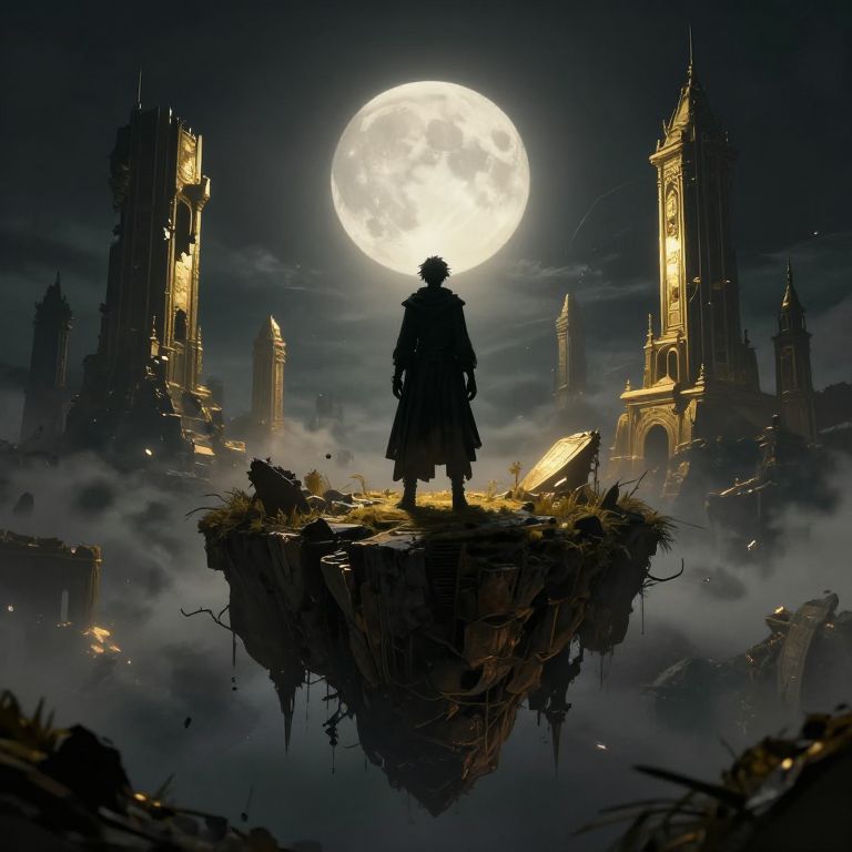 X-t3al standing on a floating island above a stormy ocean, surrounded by bioluminescent plants and ancient machinery, storm clouds crackling with energy, atmospheric depth, dreamlike fantasy aesthetic, Flux style.