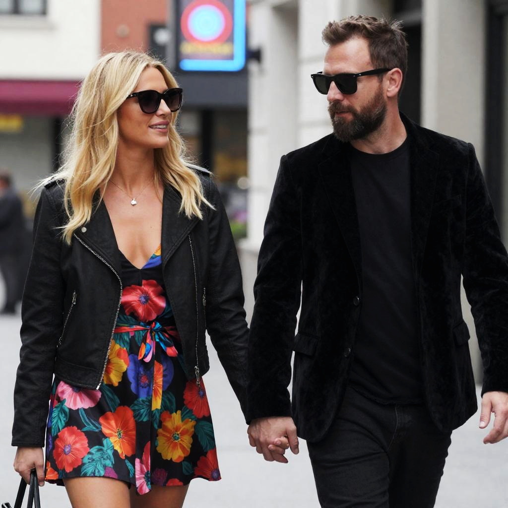 Photograph of a blonde woman and a bearded man walking on a city street. Woman wears large sunglasses, colorful floral dress, black jacket. Man wears black velvet jacket, black shirt, black sunglasses. Background shows buildings, neon sign. They hold hands, woman smiles, man looks at her. Casual, street setting.