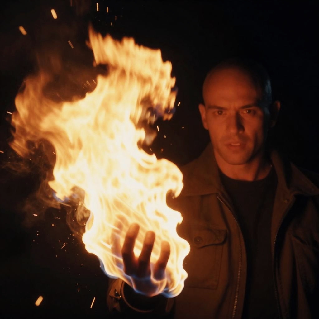 Mid-shot of a bald man with intense expression, fire erupting from his right hand, yellow-orange flames, dark background, sparks flying.
