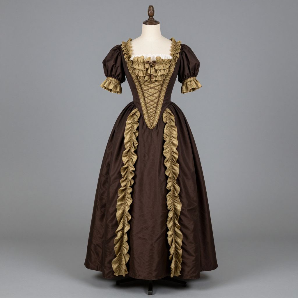 Victorian Costume Design, woman in a brown dress with a gold frilling
