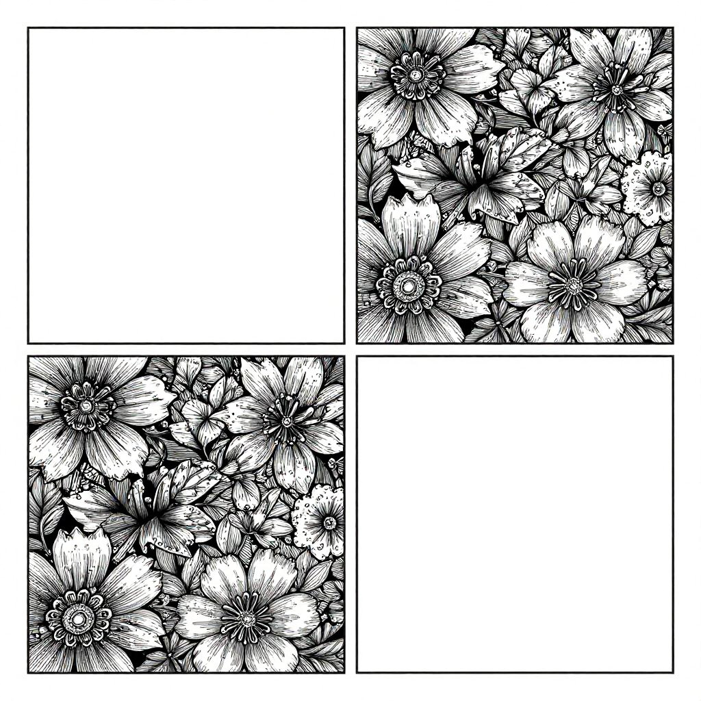 This black-and-white digital drawing features a four-panel layout with detailed, intricate floral patterns. Each panel contains densely packed, highly detailed flowers with visible petals, stamens, and leaves, rendered in a cross-hatching style. The flowers vary slightly in size and orientation within each panel. The top-left and bottom-right panels are filled with floral patterns, while the top-right and bottom-left panels are mostly blank with a small section of flowers in each. The background is white, and the floral designs are in bold black ink, creating a stark contrast. The image has a clean, grid-like arrangement with each panel bordered by thin black lines.