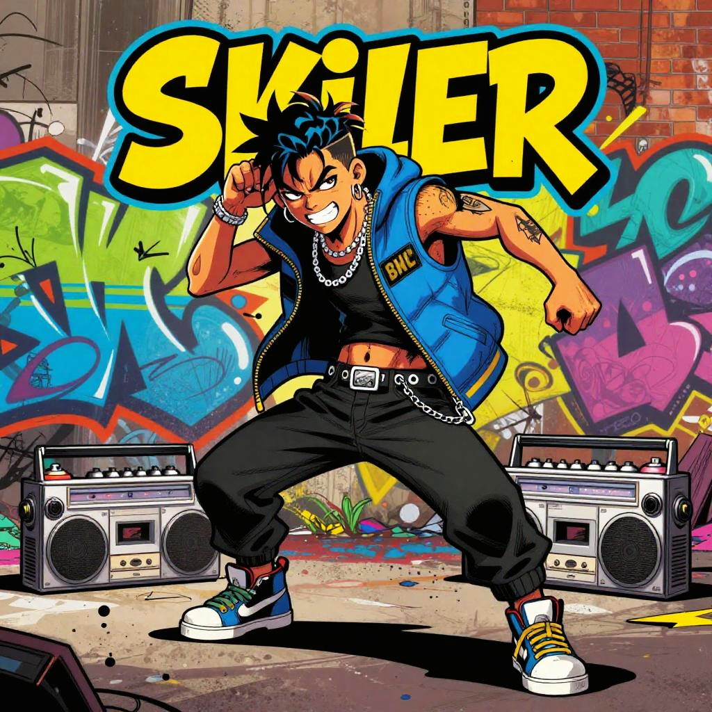 A stylized comic book cover featuring Skieer as a rebellious street artist and rapper, spray paint cans and boombox nearby, dynamic pose with intense expression, graffiti murals in the background, bold lines and saturated colors, urban and energetic atmosphere.