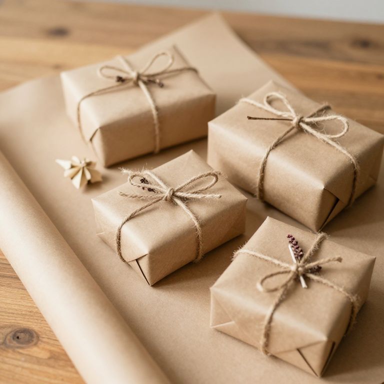 Kraft wrapping paper scene with eco-friendly gifts, natural jute twine, dried flowers decoration, minimalist rustic style, muted warm tones, wooden table background, soft natural sunlight, seasonal festive mood, organic materials theme
