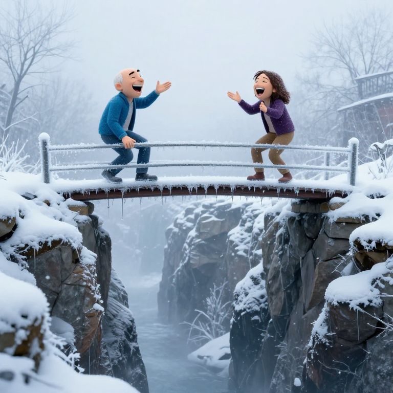 Photograph of a snowy winter scene featuring a small, metal footbridge spanning a rocky, snow-covered gorge with a waterfall. Two cartoon-style, animated characters are standing on the bridge. The male character, with a bald head, blue jacket, and gray pants, is on the left, smiling and waving. The female character, with curly brown hair, wearing a purple jacket and brown pants, is on the right, smiling and waving back. Both characters have exaggerated, joyful expressions. The background includes snow-covered trees and a misty, wintry atmosphere. The bridge has a simple, metal railing, and the rocks are dark gray with patches of white snow.