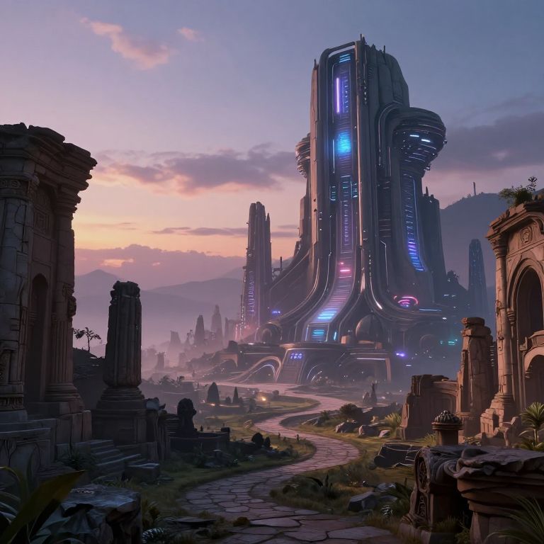 This digital artwork depicts a futuristic, sci-fi landscape at dusk. A towering, neon-lit skyscraper with glowing blue and purple lights dominates the center, set against a pastel purple and pink sunset sky. The structure features sleek, curved lines and multiple levels with illuminated panels. In the foreground, ancient, ruined stone pillars and arches are scattered, contrasting with the modern architecture. A winding, cobblestone path leads towards the skyscraper, surrounded by grassy patches and small shrubs. The background includes misty mountains and additional futuristic buildings. The image combines elements of ancient ruins with advanced technology, creating a blend of historical and futuristic aesthetics.