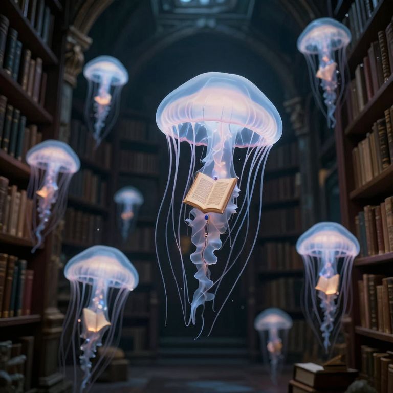 Surreal cable cars suspended above an ethereal underwater canyon transport glowing libraries filled with books, defying gravity and reality in a dreamlike aquatic realm.