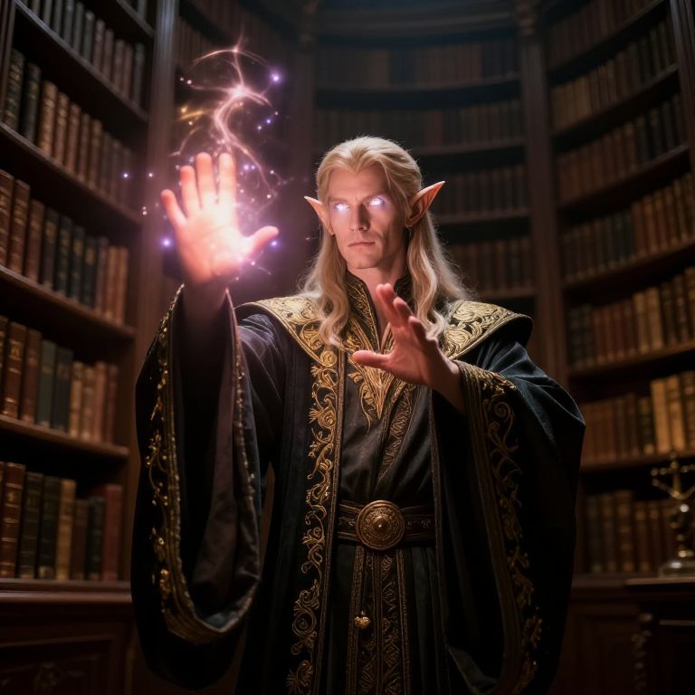 A digital fantasy illustration of a tall, blonde, elven sorcerer with pointed ears, glowing blue eyes, and long hair. He wears an ornate black and gold robe with intricate embroidery. He stands in a dimly lit, grand library filled with tall, dark wooden bookshelves. The sorcerer's right hand is raised, emitting a bright, magical glow with sparkling effects. His left hand is slightly extended forward, fingers spread. The background is filled with rows of leather-bound books, enhancing the mystical, scholarly atmosphere. The overall style is detailed and realistic, with a magical, fantasy theme.