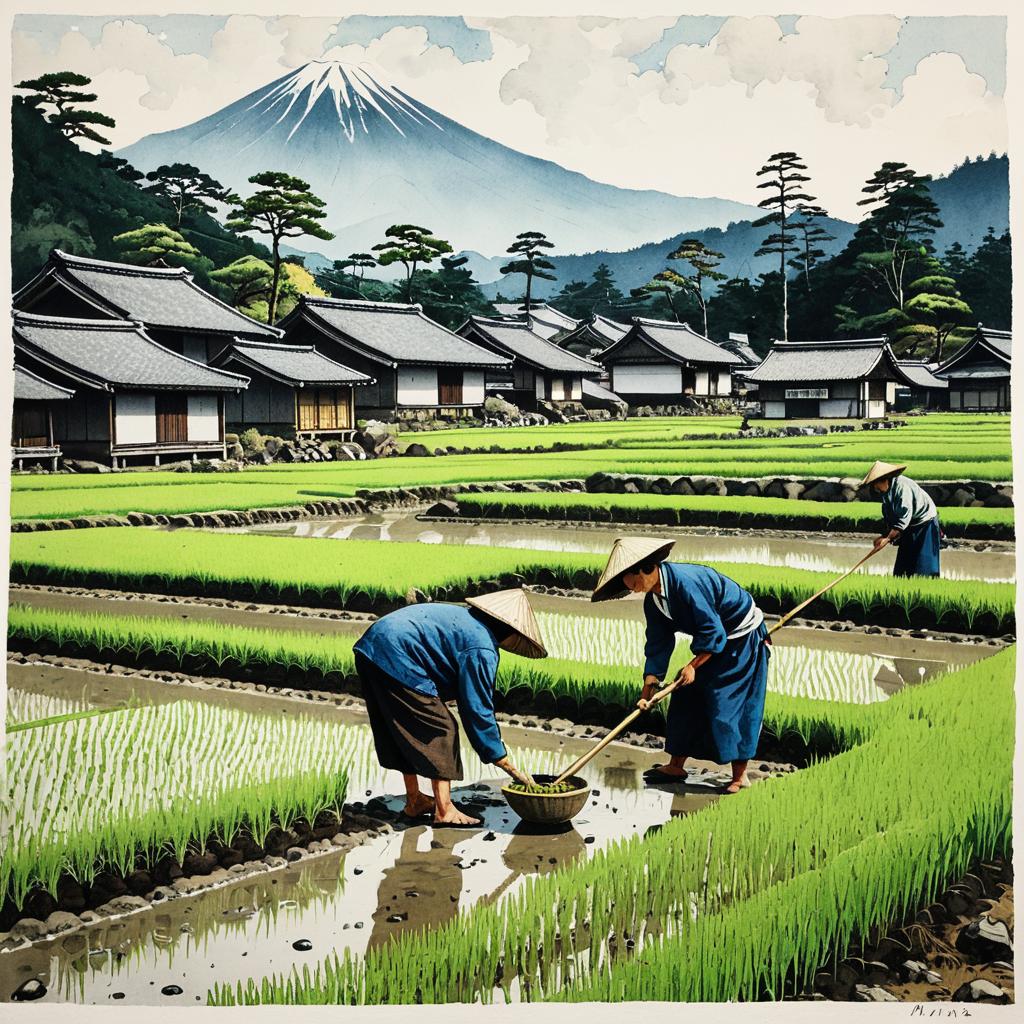 Tattoo art landscape, farmers planting rice in a traditional Japanese village, surreal, vibrant, hand-drawn, watercolors, style of Mipxia Kuciara