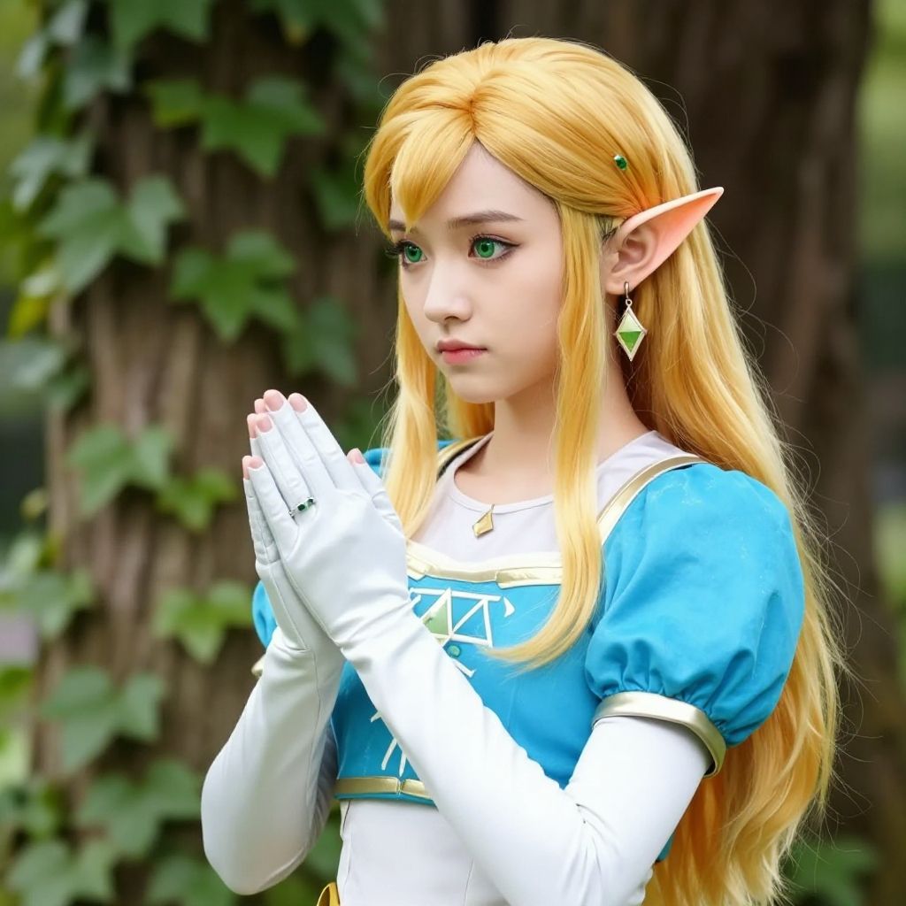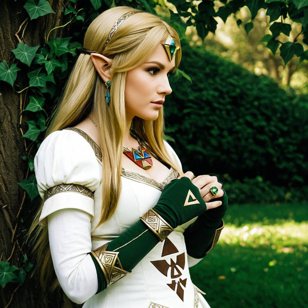 Princess zelda, 1girl, bangs, blonde hair, breasts, bridal gauntlets, closed mouth, expressionless, from side, green eyes, highres, ivy (sena0119), jewelry, long hair, long sleeves, nintendo, outdoors, own hands together, pointy ears, ring, small breasts, solo, standing, the legend of zelda, tree, triforce print, upper body