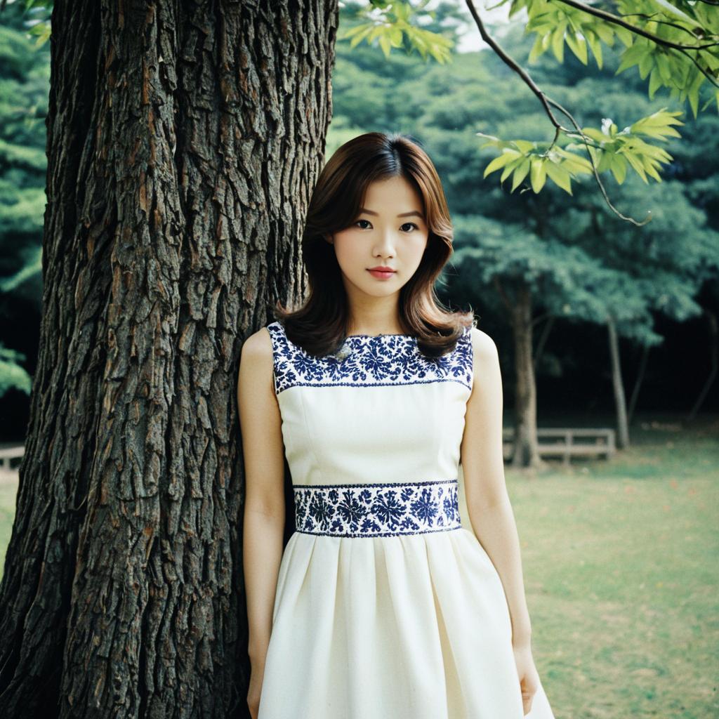 Korean party wear dress,1girl, solo, dress, brown hair, realistic, tree, outdoors, brown eyes, looking at viewer, photorealistic